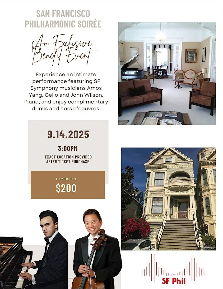 Join us for an exclusive benefit soirée, featuring special performances by Wyatt Underhill and John Wilson of the San Francsico Symphony. Mingle with fellow music lovers at the stunning and famous Blue Painted Lady House on Alamo Square, and enjoy complimentary hors d’oeuvres and drinks–all while helping to underwrite the SF Phil’s 2025-2026 season!